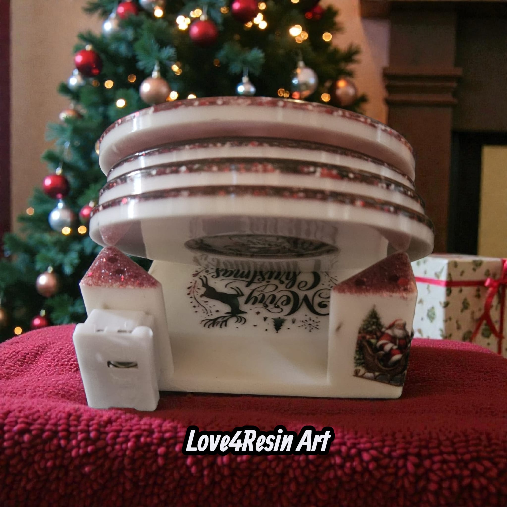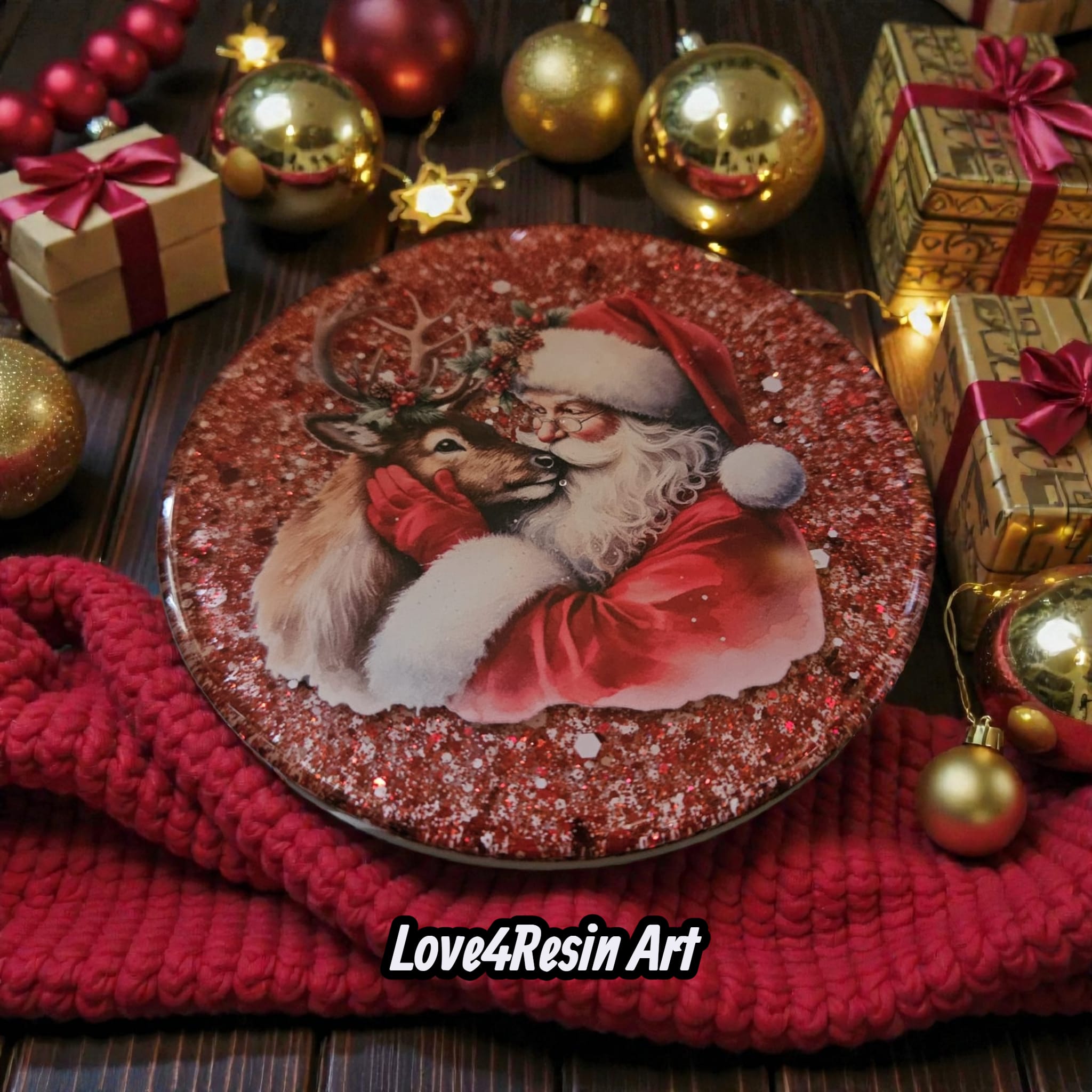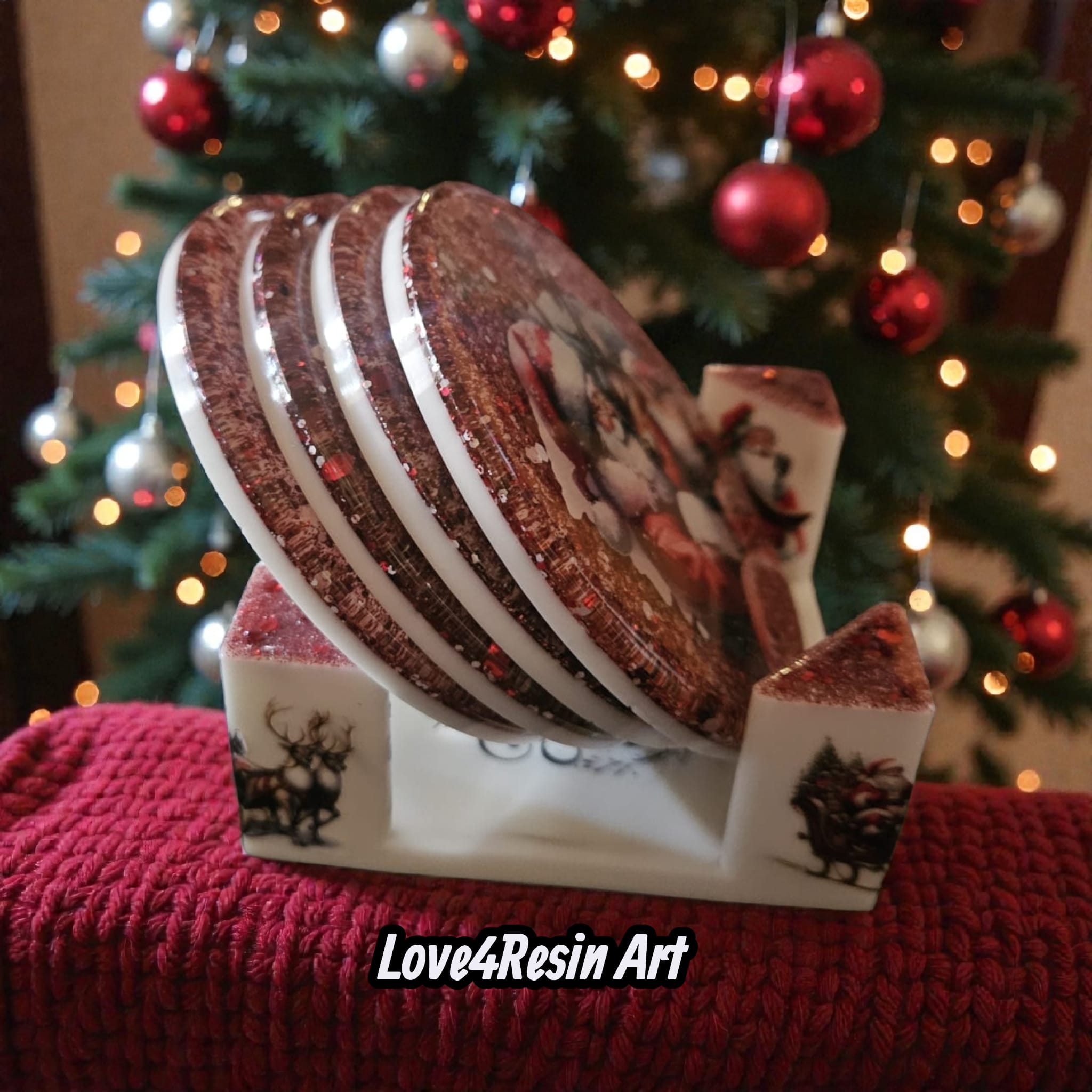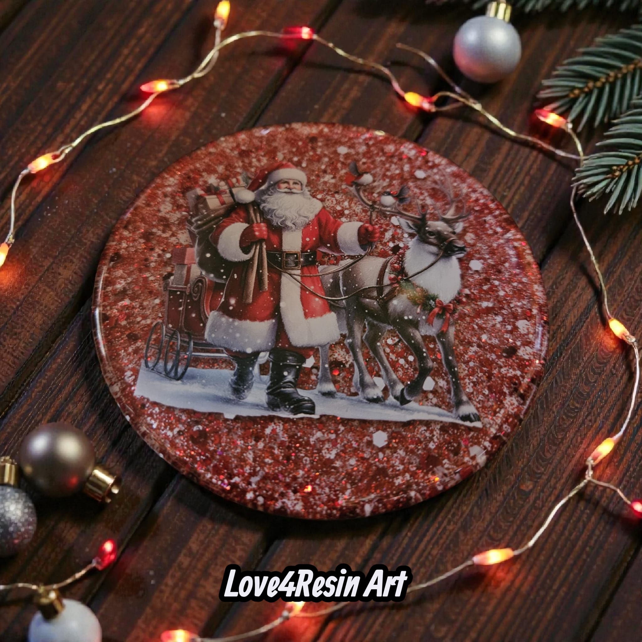 În centrul fiecărui coaster se află o scenă clasică de Crăciun: Moș Crăciun și renii săi, surprinși în momente pline de tandrețe, grijă și magie. Fundalul roșu intens, presărat cu sclipiri ca de zăpadă, creează profunzime și emoție, iar stratul lucios de rășină fixează scena ca într-o amintire de neuitat.