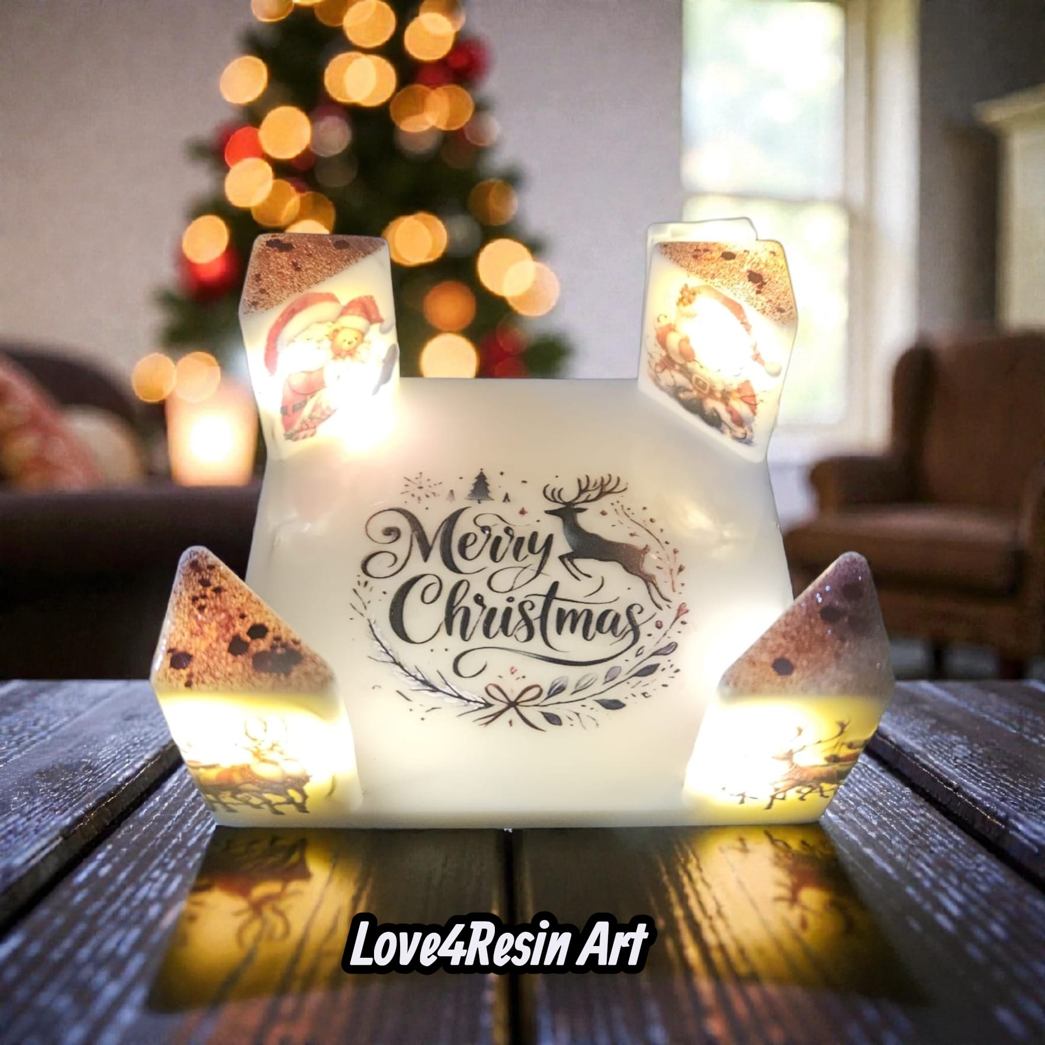 Există obiecte care îți plac și există obiecte care creează atmosferă. Acest set de suporturi luminoase de Crăciun, realizat manual din rășină, face parte din a doua categorie. Nu este doar un accesoriu pentru masă, ci un mic ritual de iarnă, o poveste caldă care prinde viață în lumină.