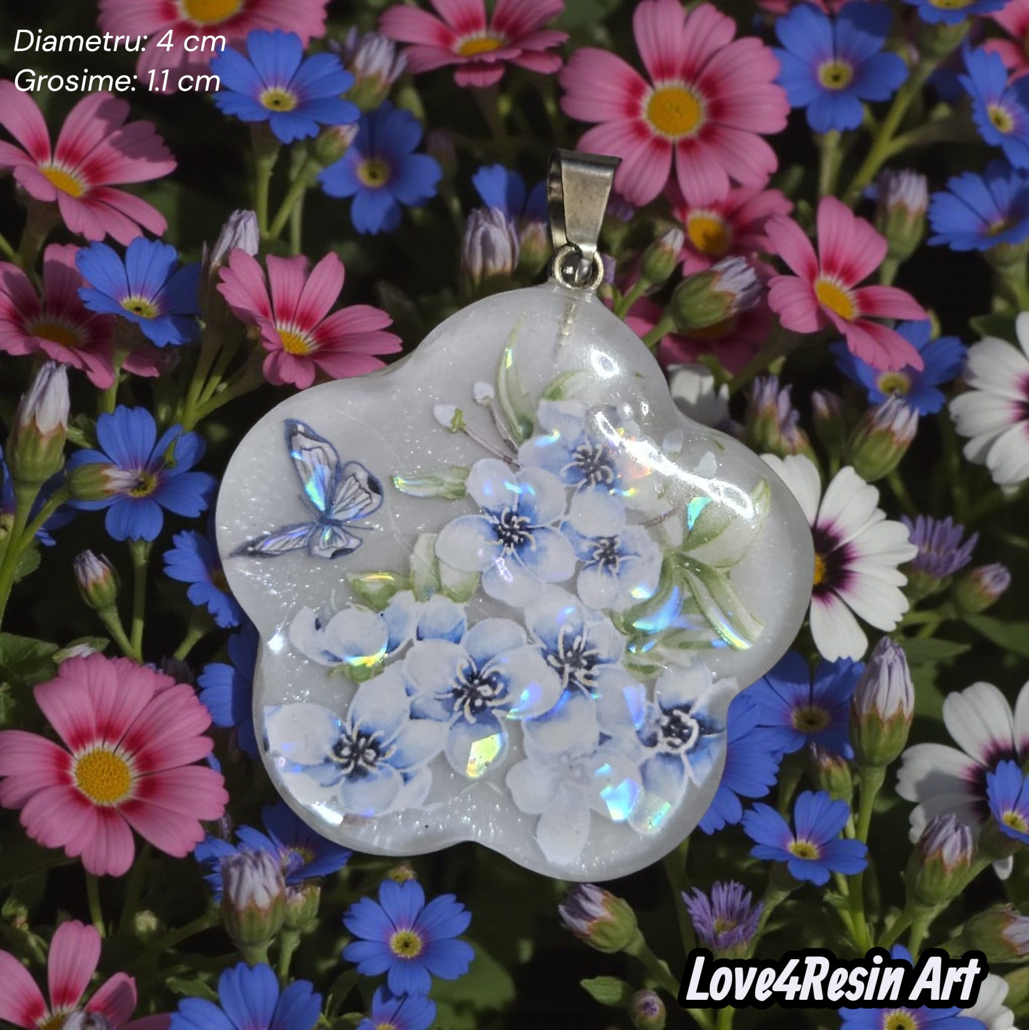 Pandantivul Forget-Me-Not Whisper este realizat manual din rășină, în formă organică de floare, având inserții delicate inspirate din florile nu-mă-uita. Designul este completat de reflexii iridescente fine și de un detaliu subtil de fluture, simbol al transformării și speranței.