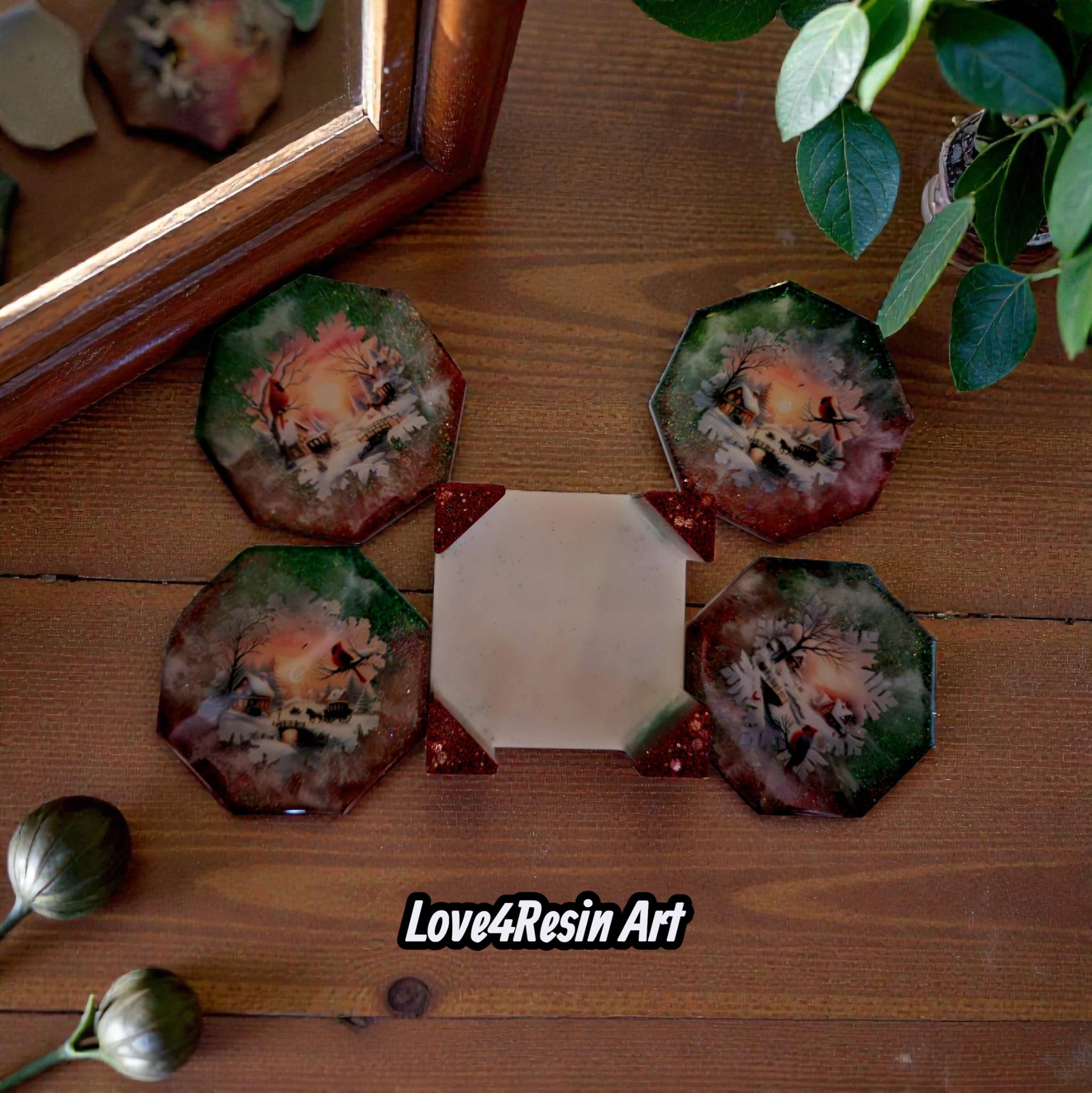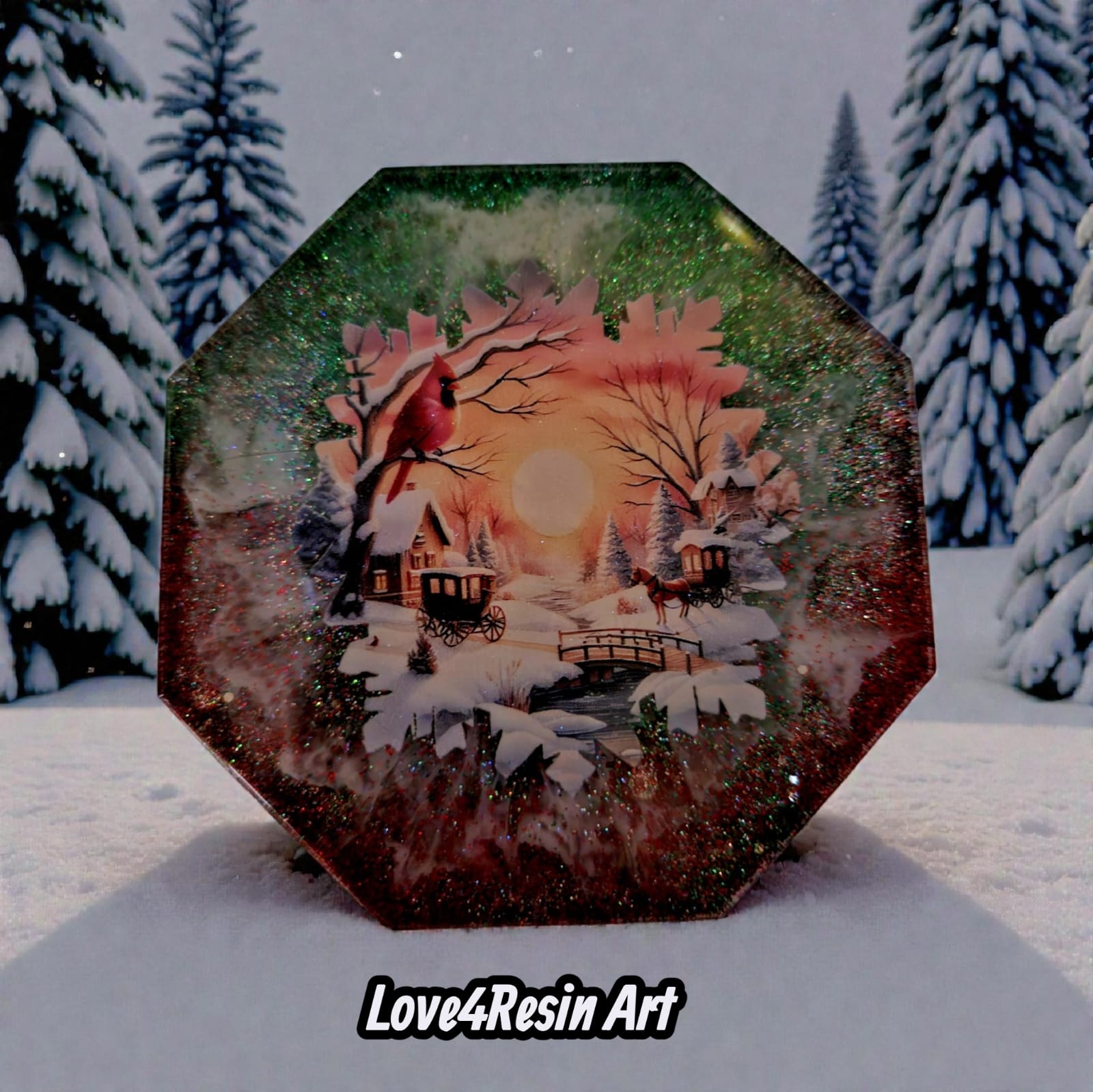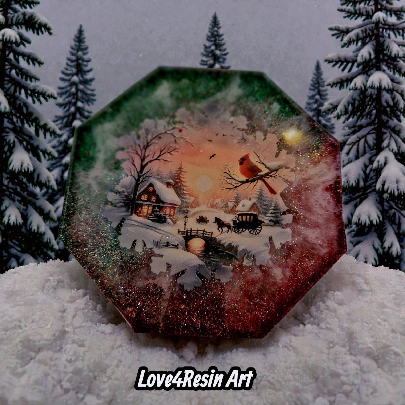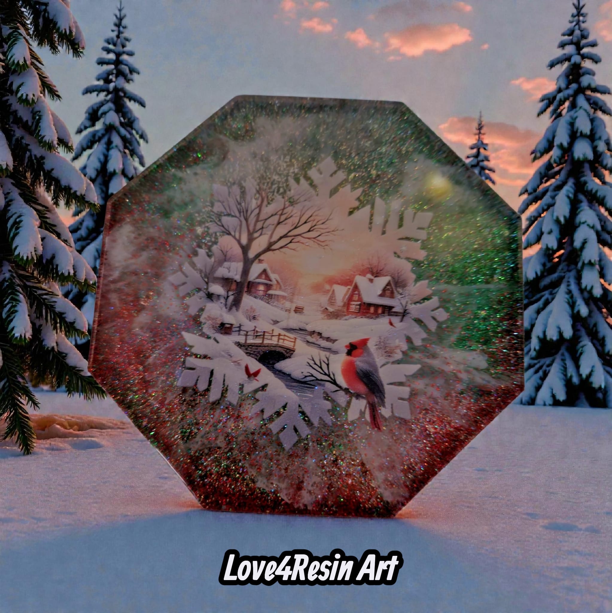 Fiecare coaster este ca o fereastră deschisă spre un sat învăluit în iarnă: căsuțe luminate cald, poduri mici peste ape înghețate, copaci încărcați de zăpadă și silueta delicată a unui cardinal roșu – simbol al speranței și al bucuriei. Sclipirile fine din rășină amintesc de zăpada proaspătă care strălucește în lumina apusului, transformând fiecare moment într-o experiență vizuală și emoțională.