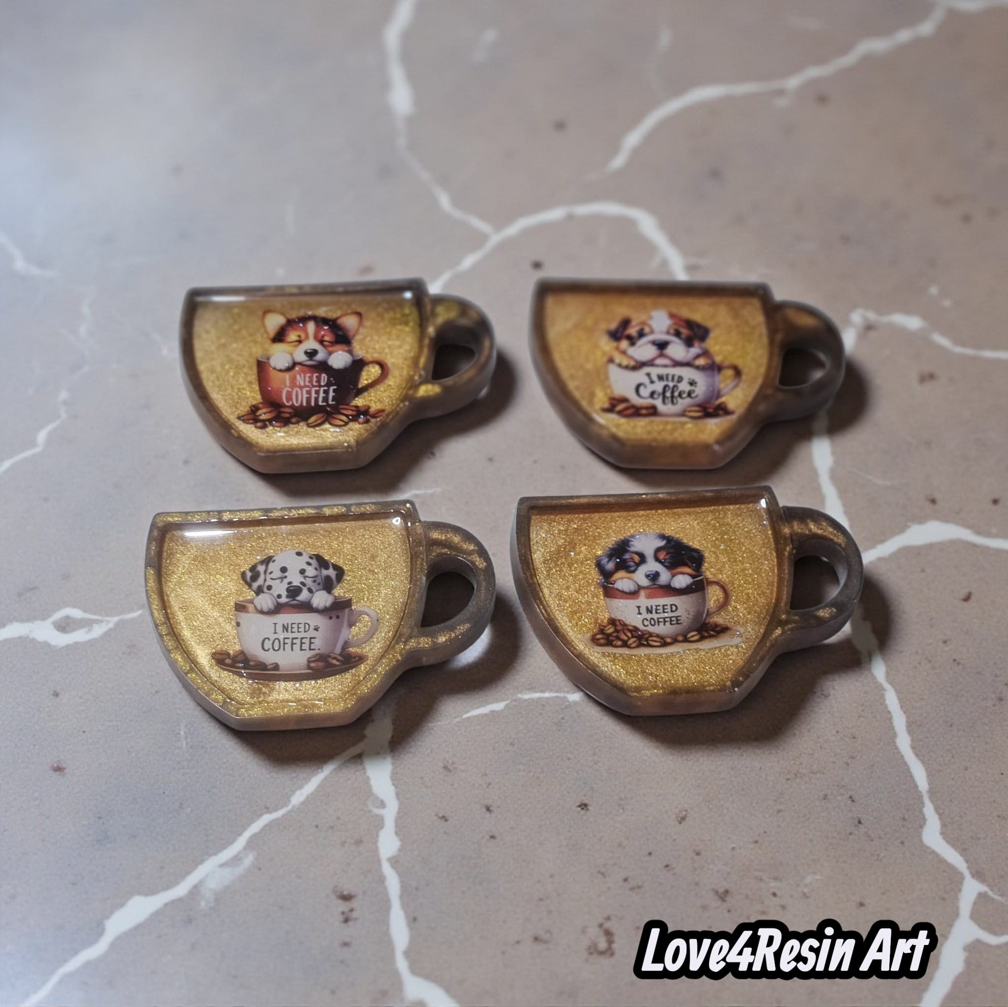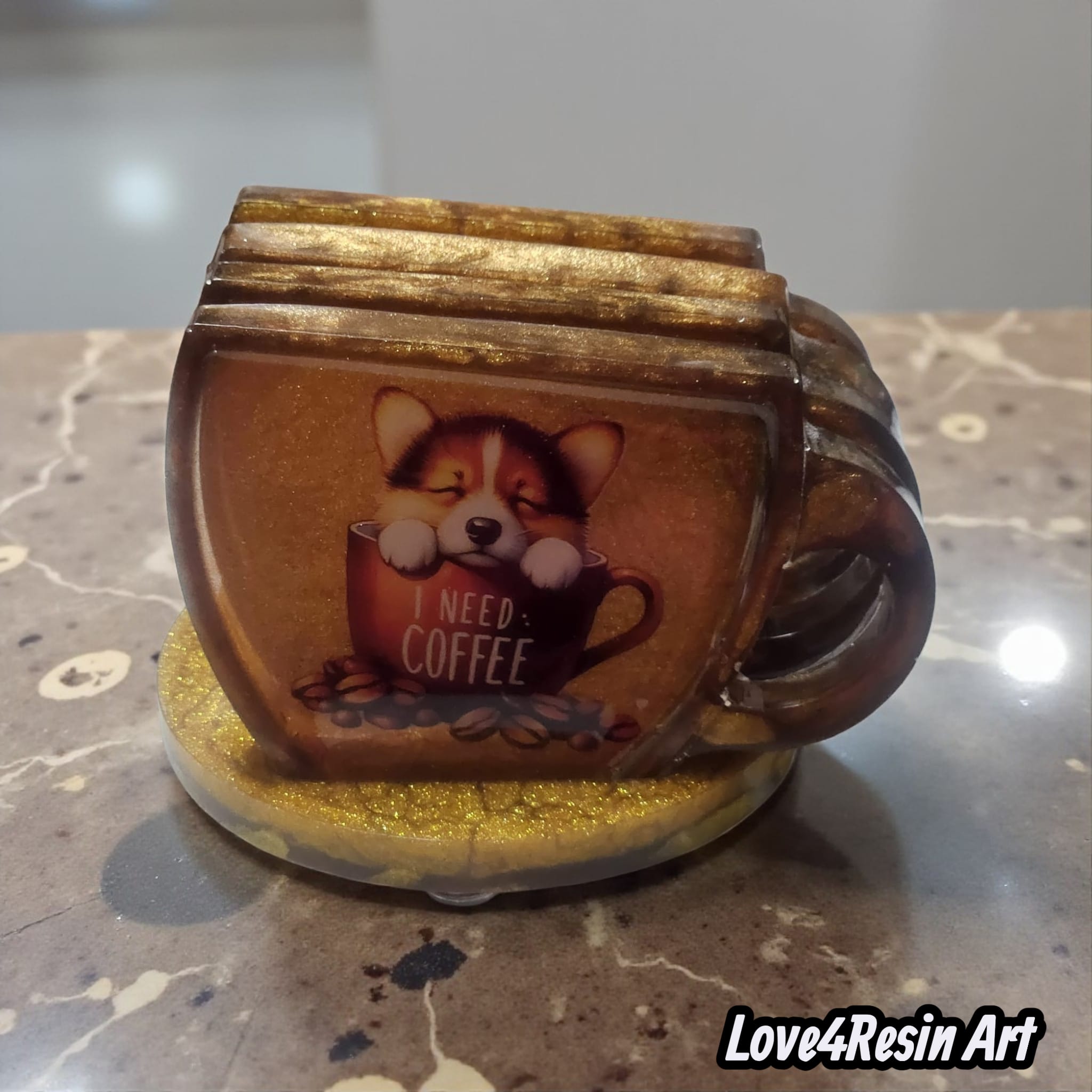 Realizat cu grijă din rășină, cu inserții delicate și un finisaj lucios, fiecare suport surprinde un cățel adorabil așezat într-o ceașcă de cafea, înconjurat de boabe aurii. Fundalul cu efect strălucitor oferă o notă caldă și elegantă, transformând fiecare piesă într-un mic tablou miniatural.