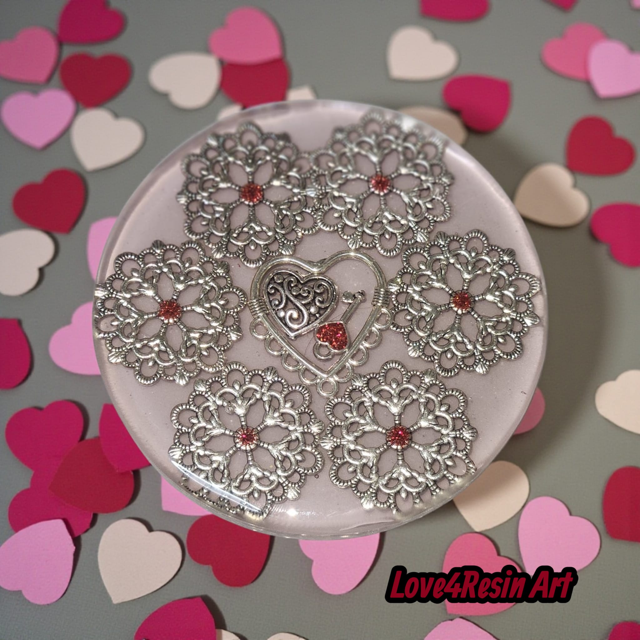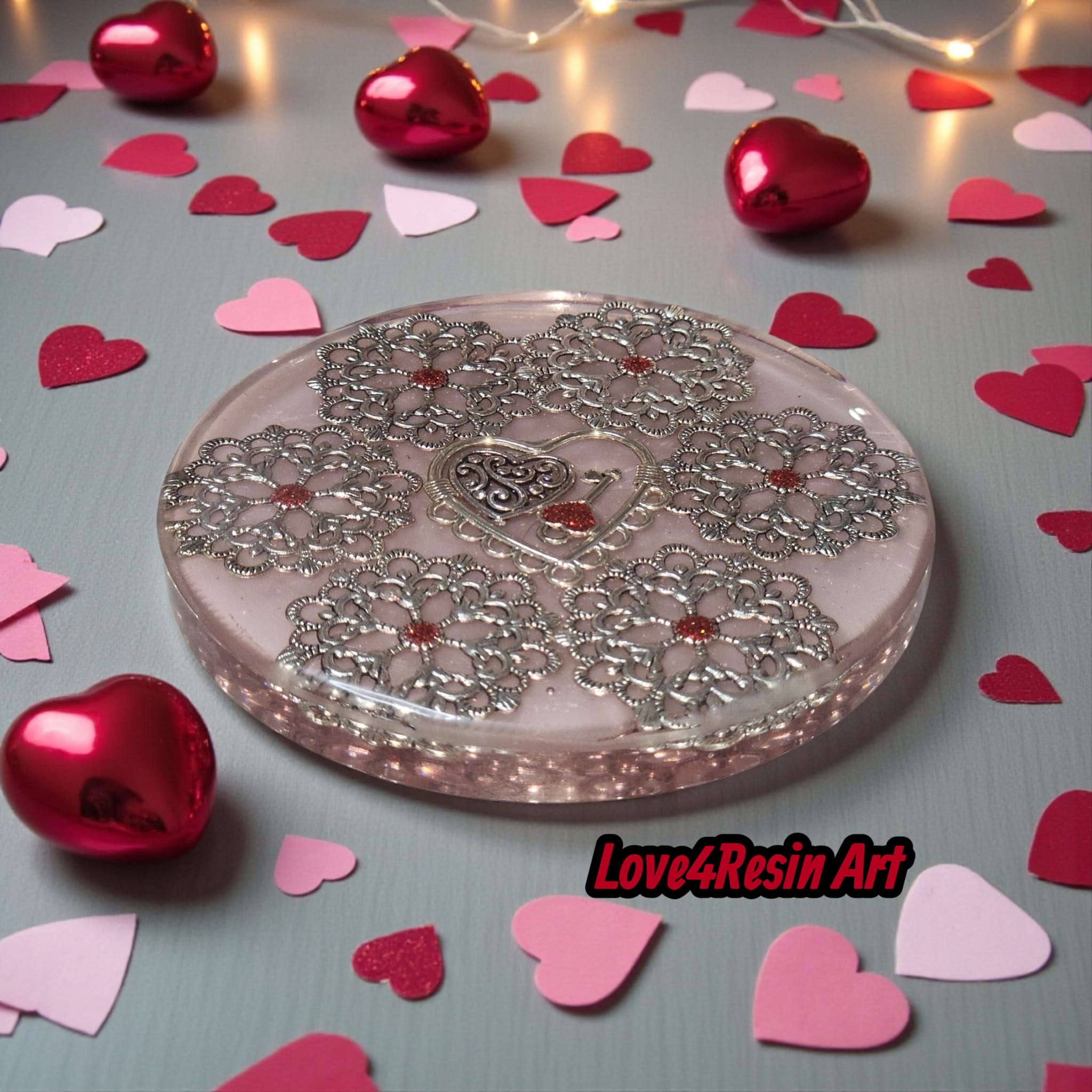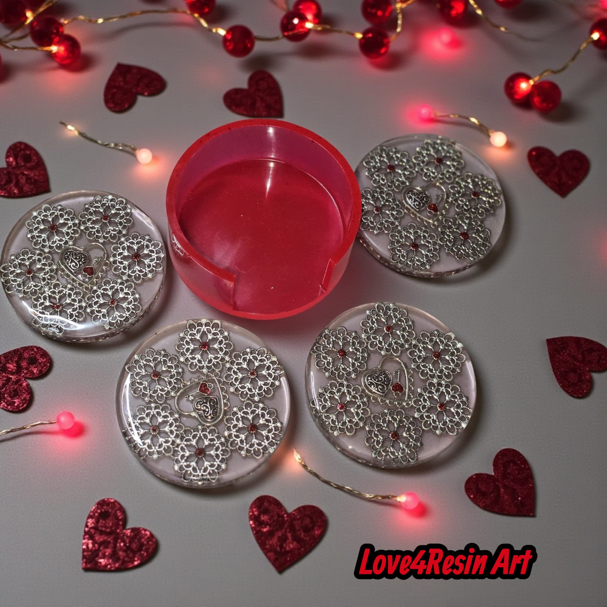 Acest set de suporturi pentru pahare nu este doar un accesoriu pentru masă, ci un mic simbol al legăturii dintre doi oameni. Fiecare coaster este realizat cu inserții metalice elegante, cu detalii florale fine și, în centru, elementul care dă sens întregului design: o inimă și cheia care o deschide — semnul că cineva deține locul special din sufletul tău.