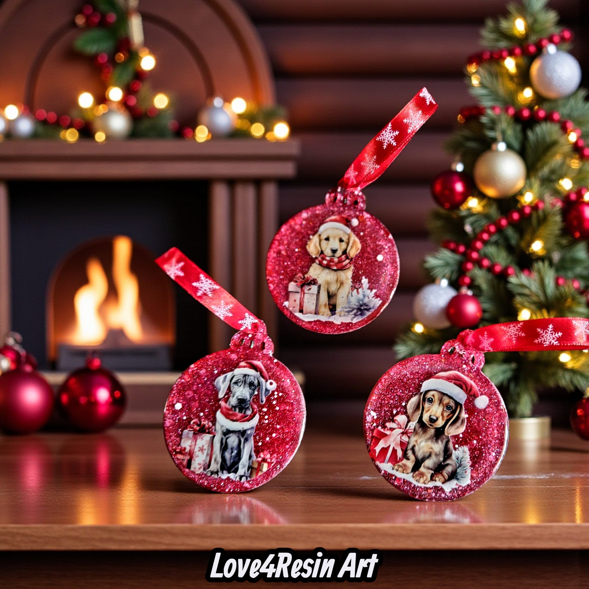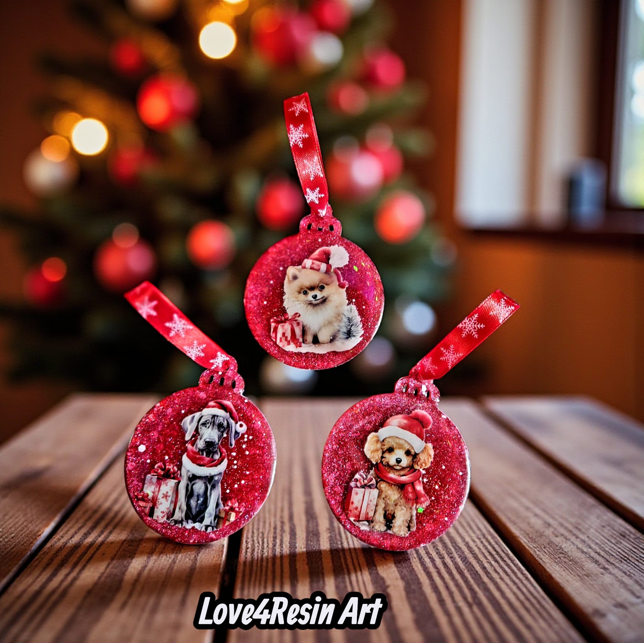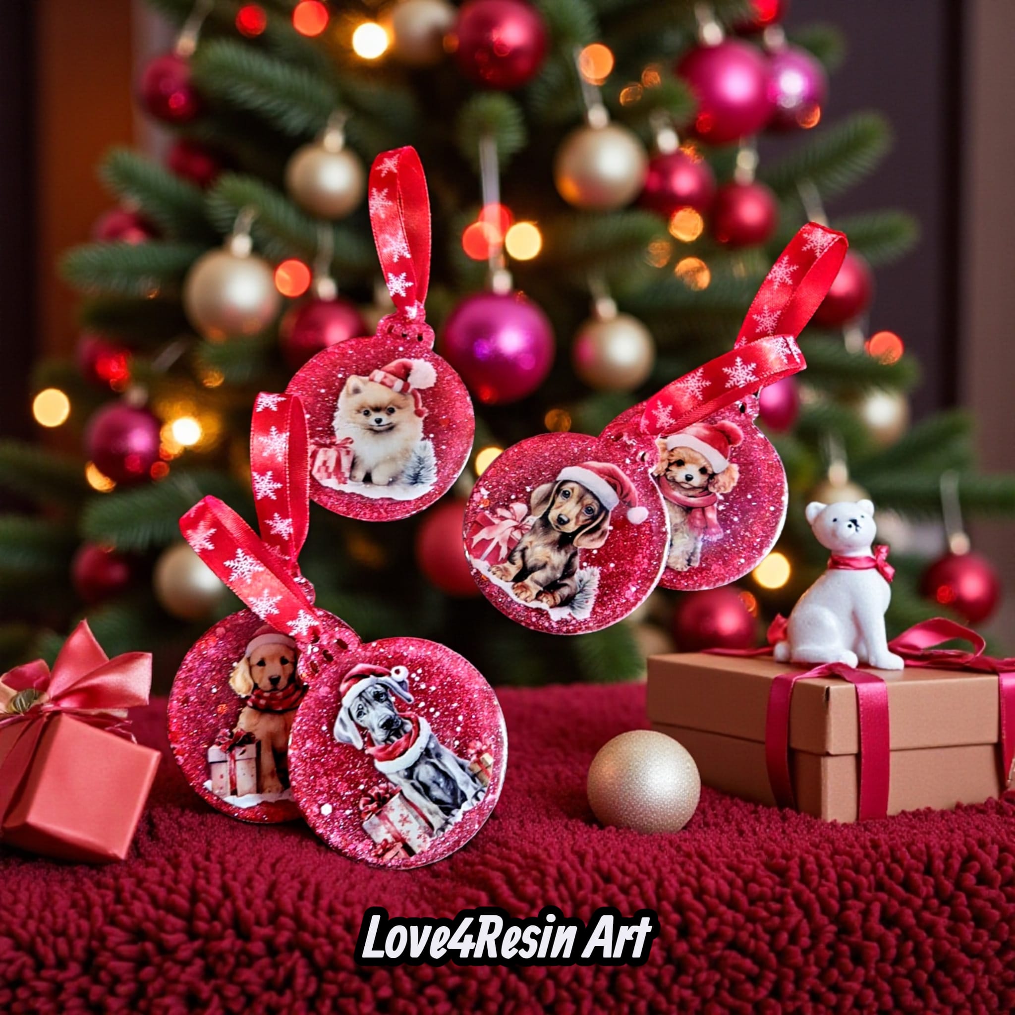 Realizate cu grijă, cu un fundal roșu festiv și accente sclipitoare, globulețele ilustrează câini în spirit de sărbătoare, purtând căciuli de Moș Crăciun, eșarfe călduroase și stând cuminți lângă cadouri. Ele nu sunt doar decorațiuni, ci emoții transformate în obiecte, amintiri care se nasc an de an în jurul bradului.