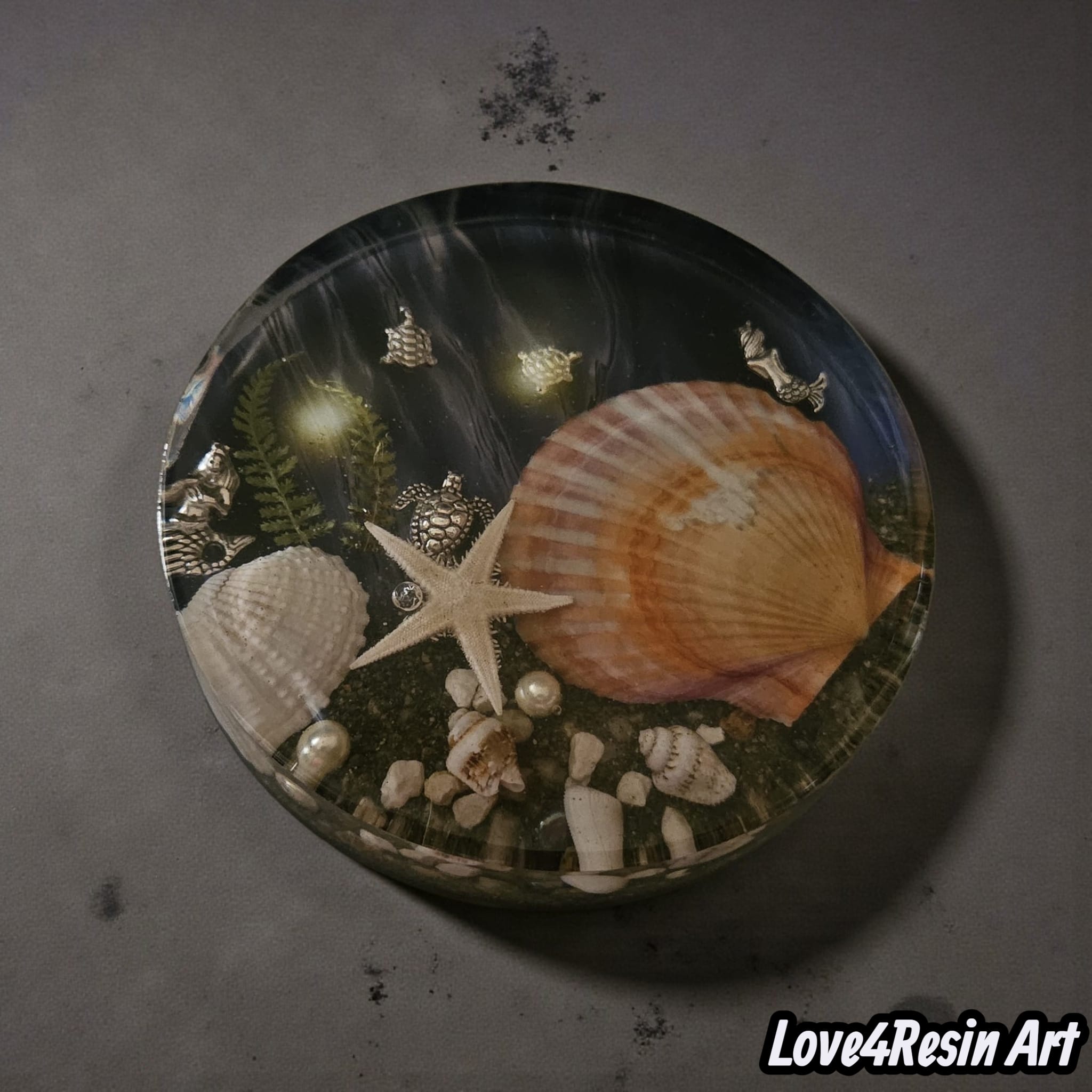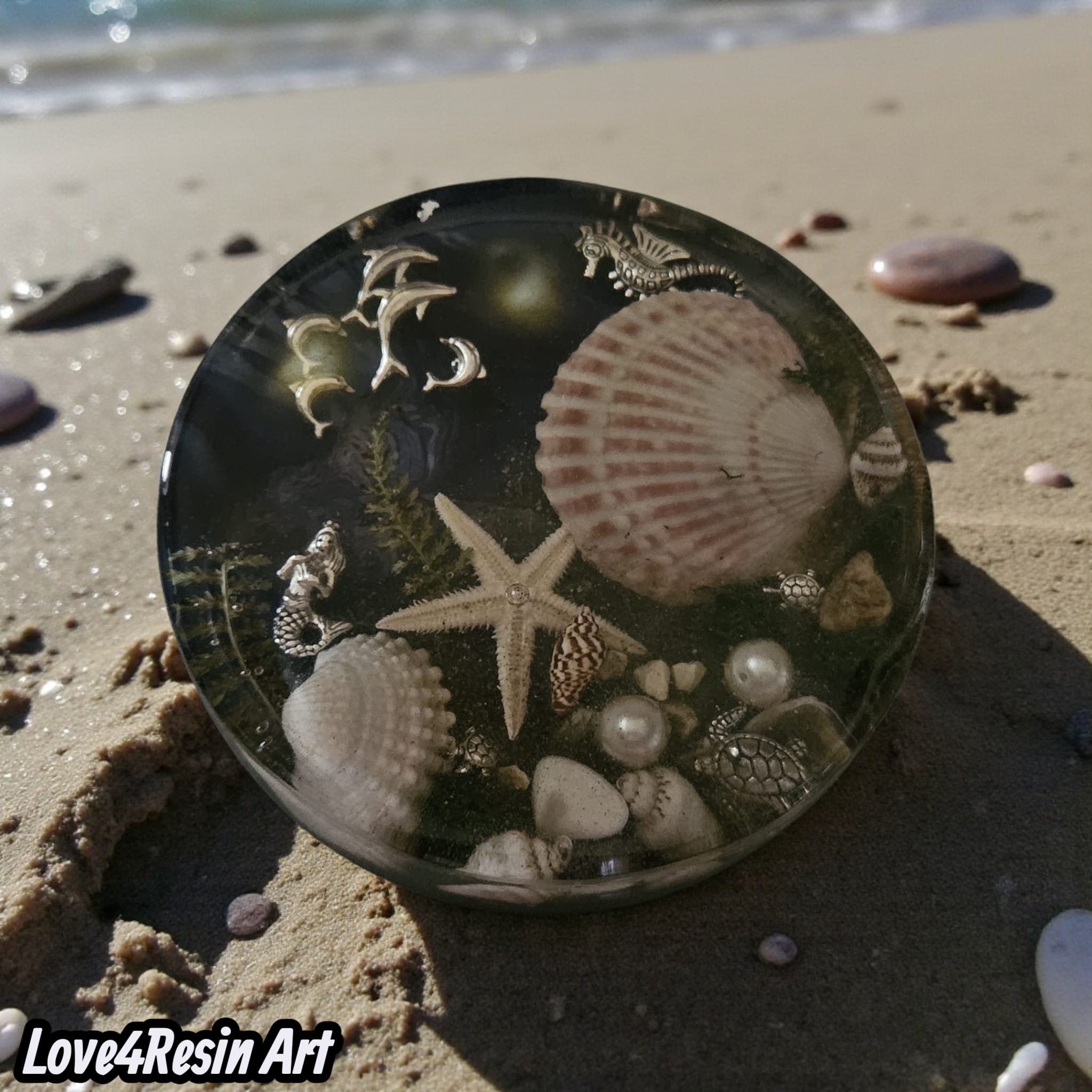 Straturile generoase de rășină creează un efect tridimensional spectaculos, ca și cum ai privi direct în adâncul mării. Fiecare detaliu este vizibil, fiecare element spune o poveste.