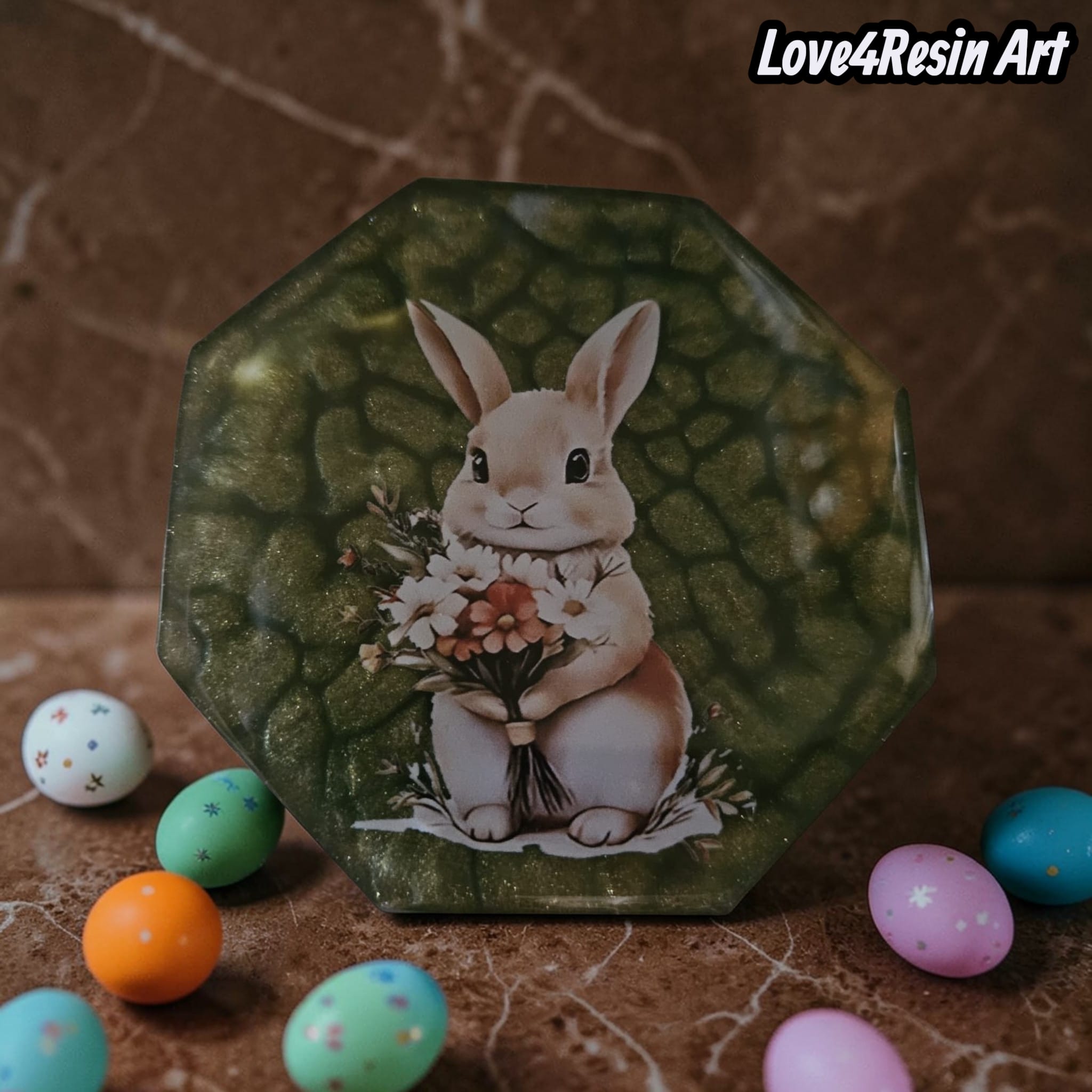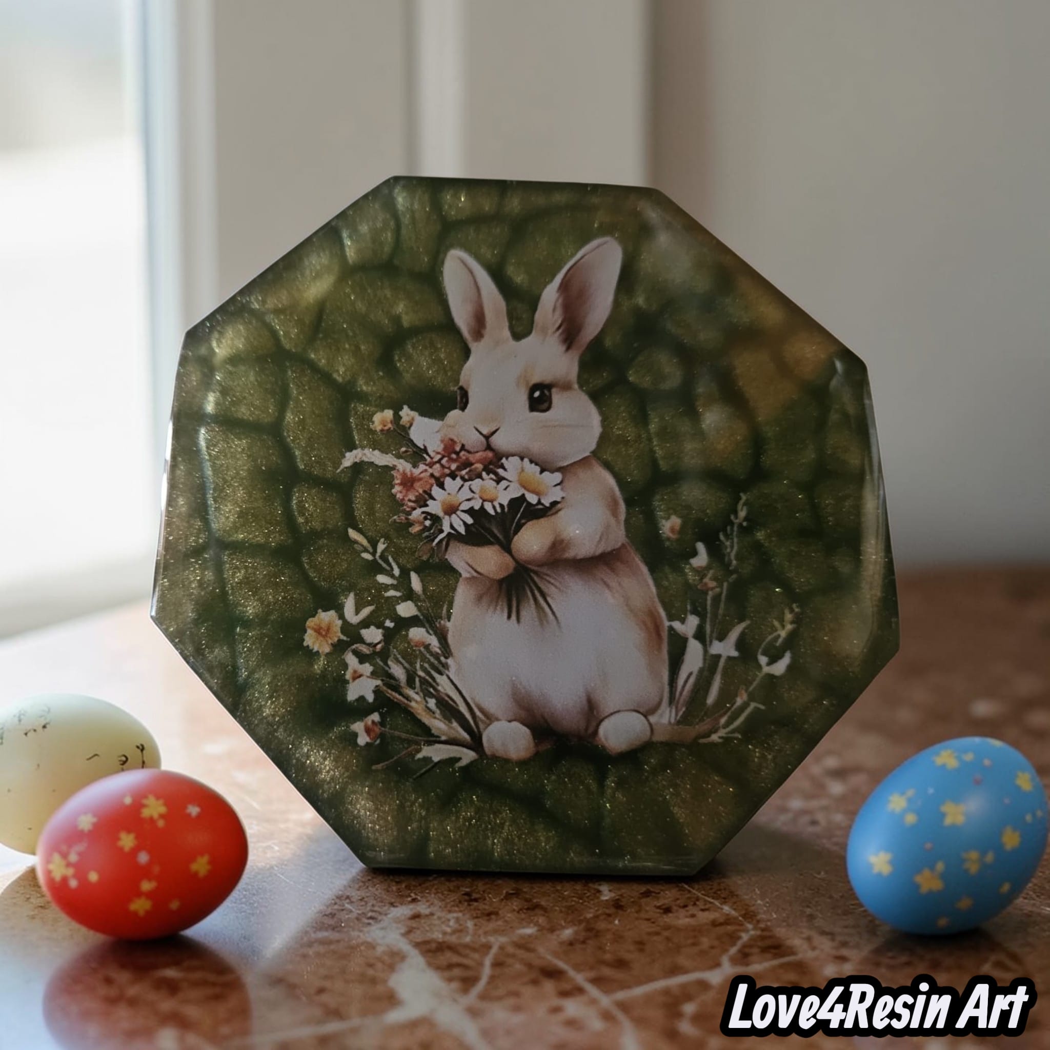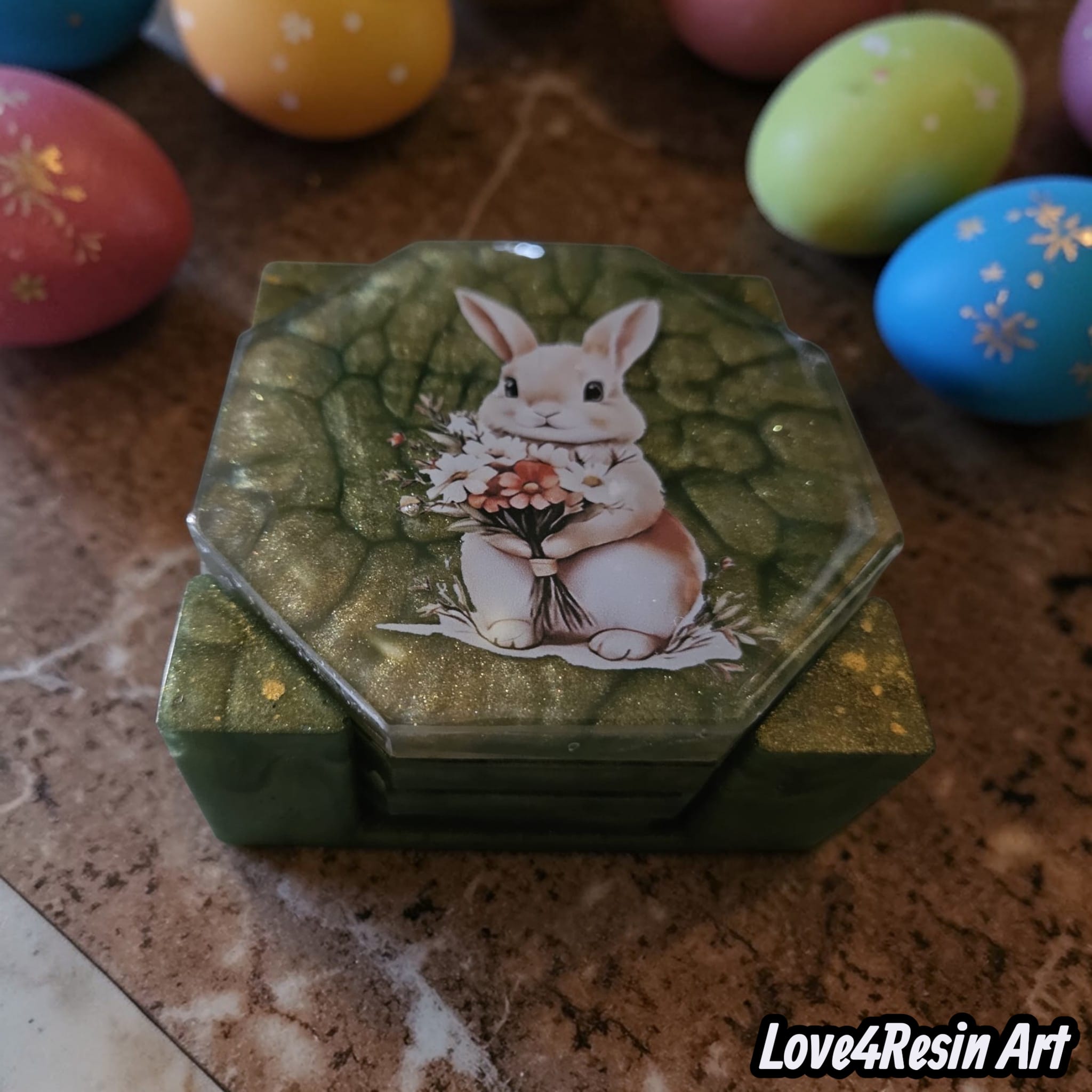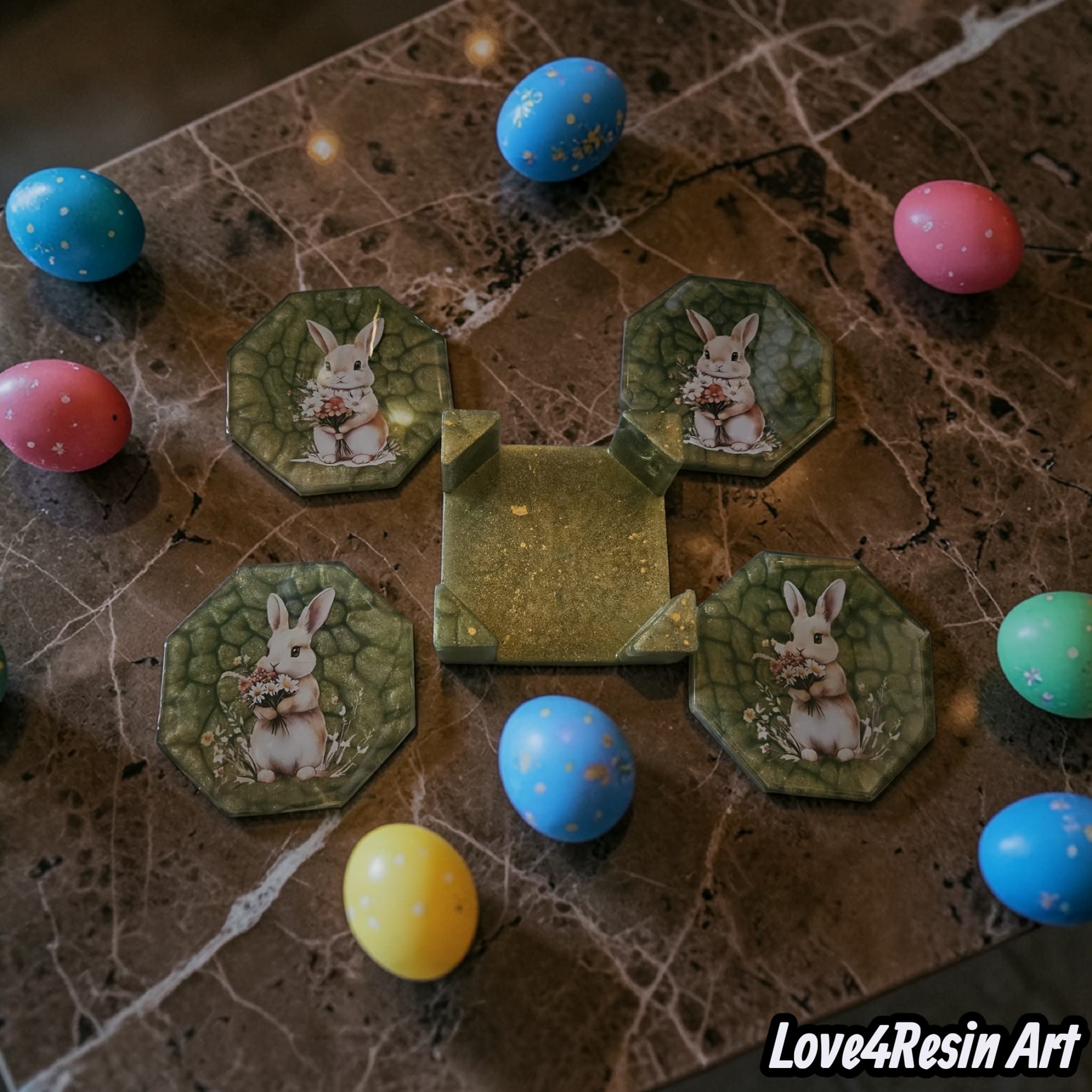 Inspirat de această magie a primăverii, am creat un set de coastere din rășină care spune o poveste: povestea unui iepuraș delicat, cu un buchet de flori în brațe, așezat într-o grădină de smarald cu reflexii fine, ca razele calde ale soarelui de aprilie.