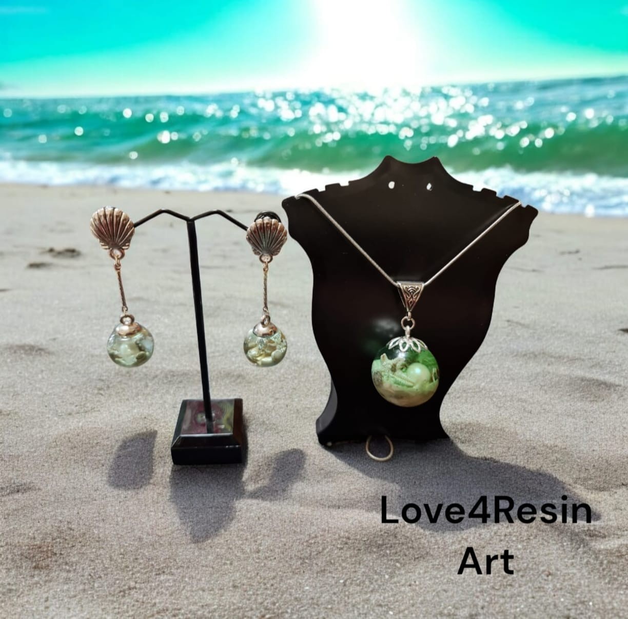Acest set rafinat, format din pandantiv și cercei, este creat cu migală din rășină epoxidică transparentă ce surprinde și conservă, ca într-o picătură de apă nemuritoare, esența țărmului.