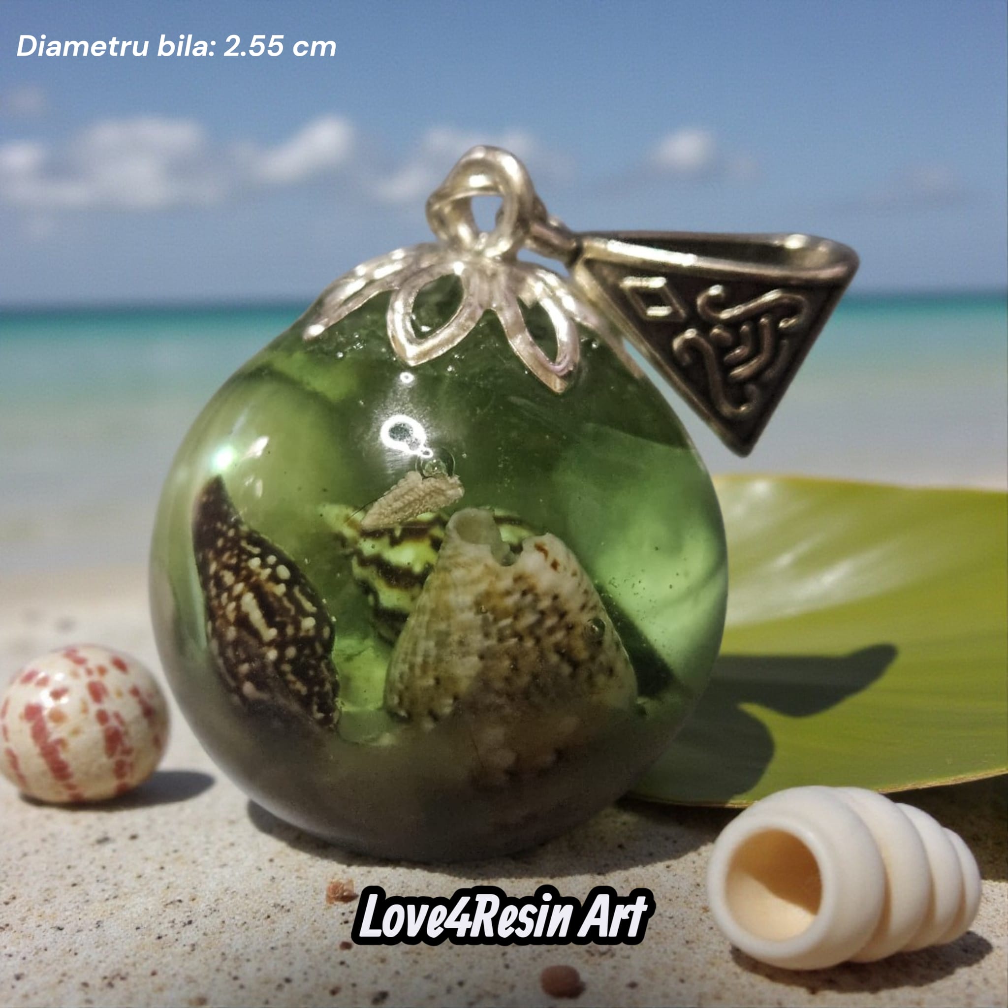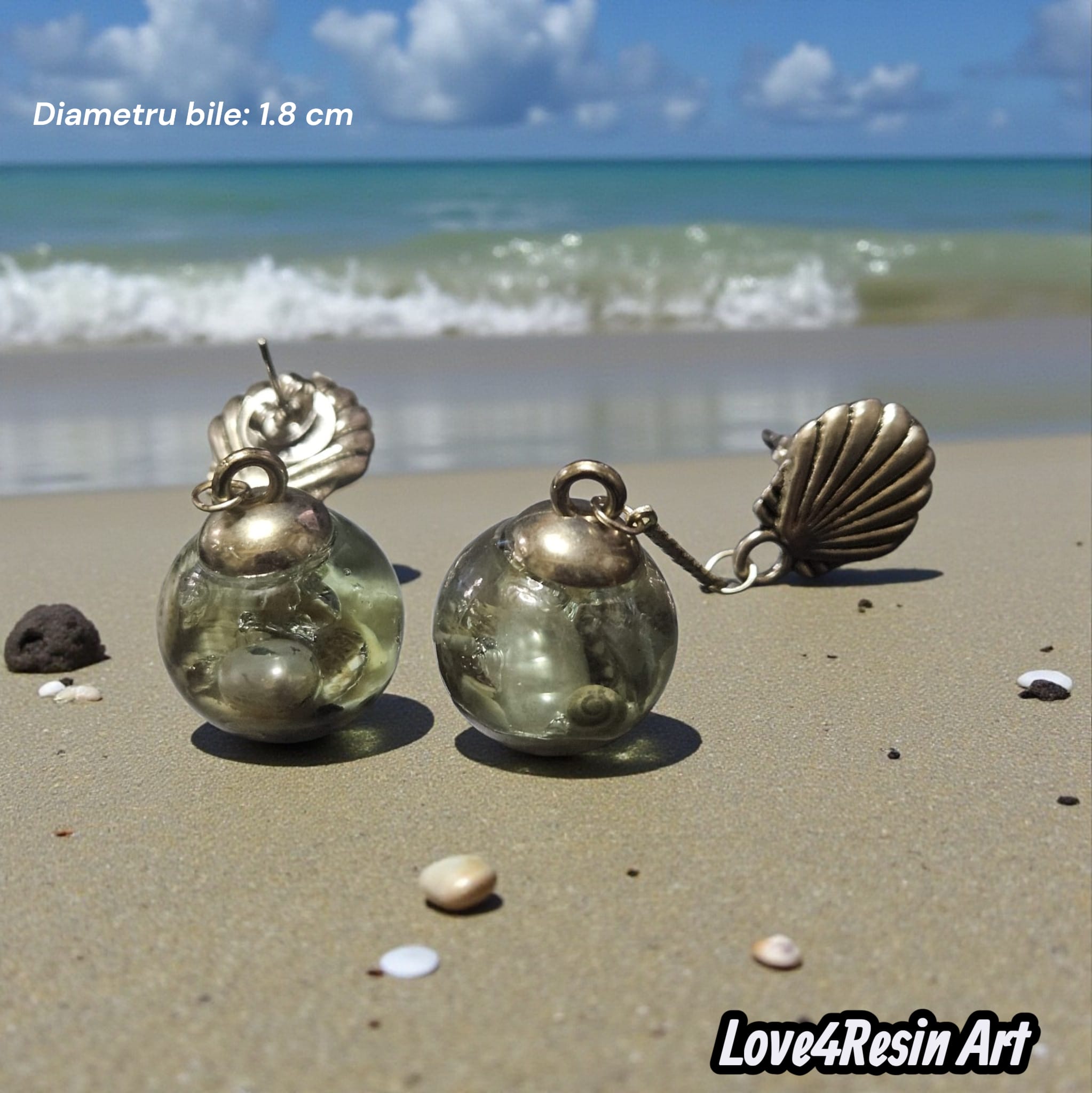 În interior, perlele naturale de cultură strălucesc subtil, ca niște comori ascunse de mare. Fragmentele delicate de scoici și nisip fin completează această mică lume marină, evocând frumusețea crudă și autentică a litoralului. Fiecare bulă perfect clară devine o amuletă în care timpul s-a oprit pentru a-ți dărui amintirea unei veri eterne.