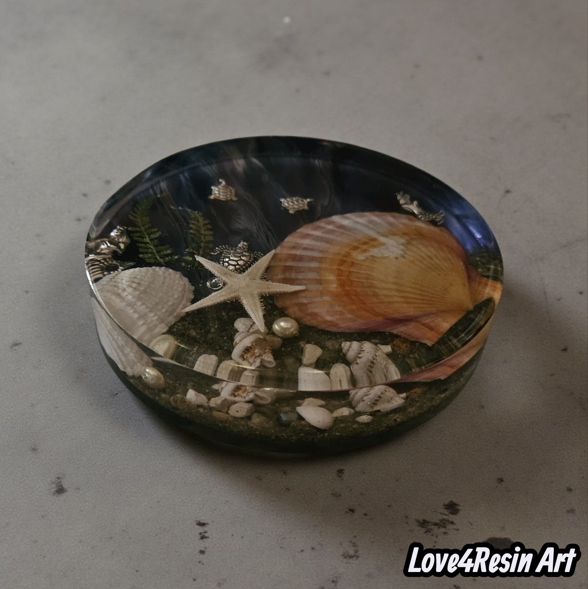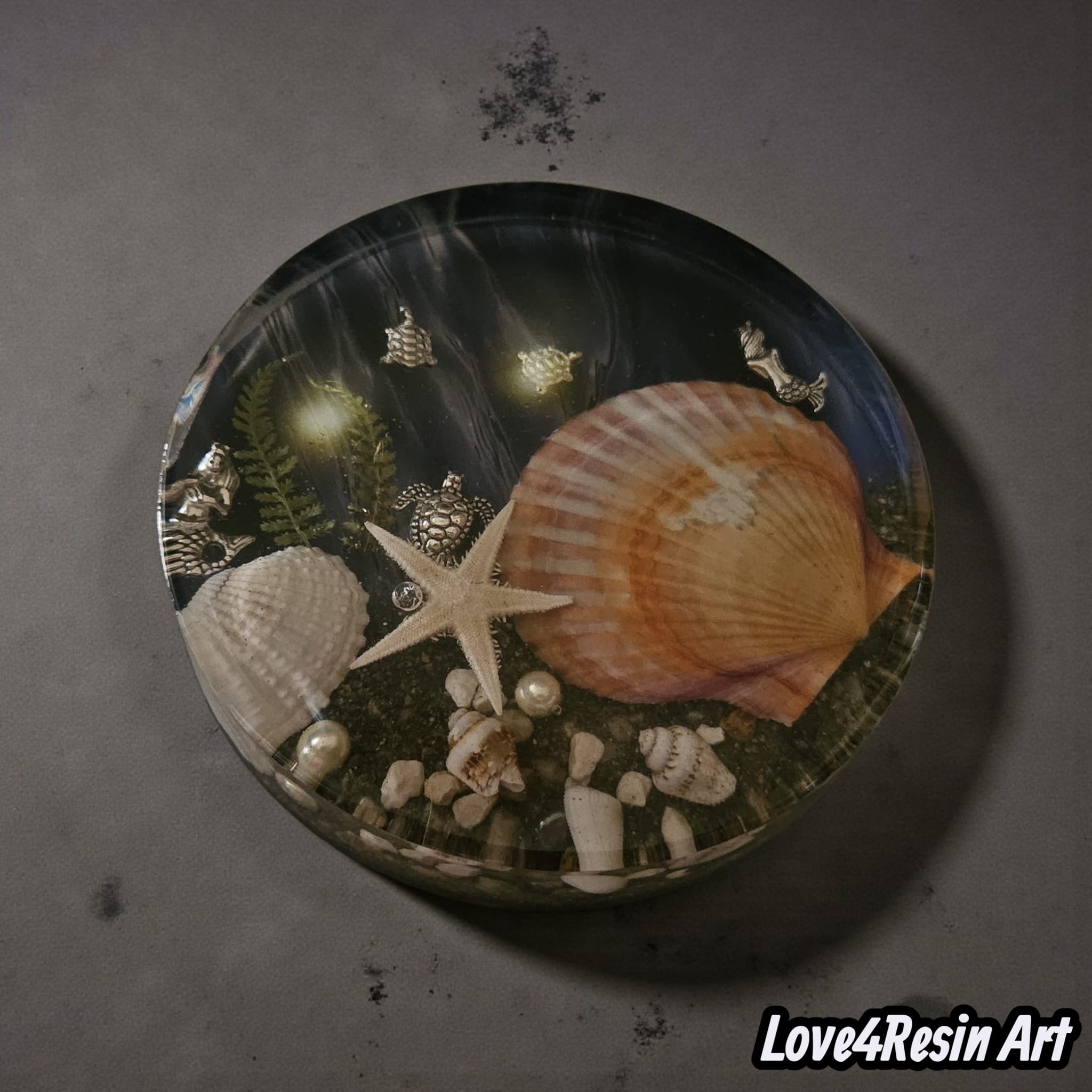 Toate aceste elemente sunt sigilate în straturi generoase de rășină transparentă, creând un efect tridimensional impresionant — ca și cum ai privi printr-o fereastră către fundul mării.