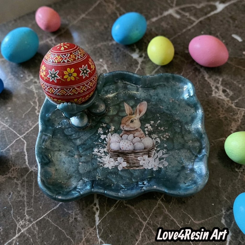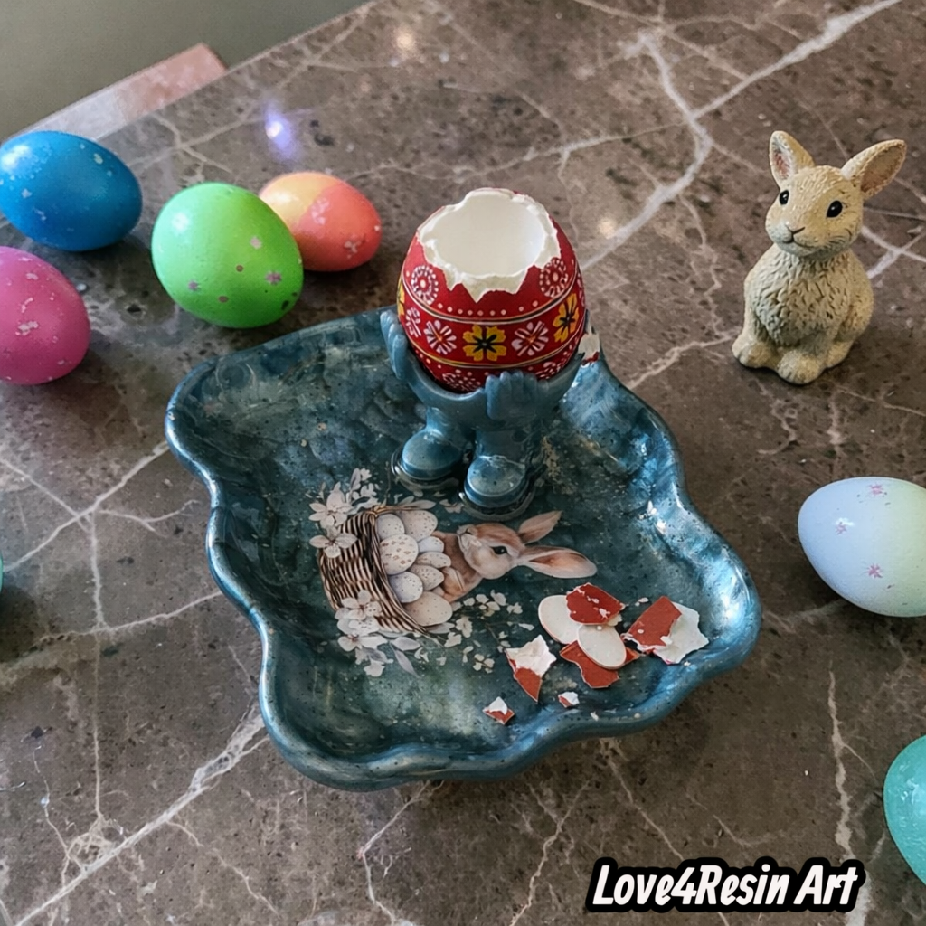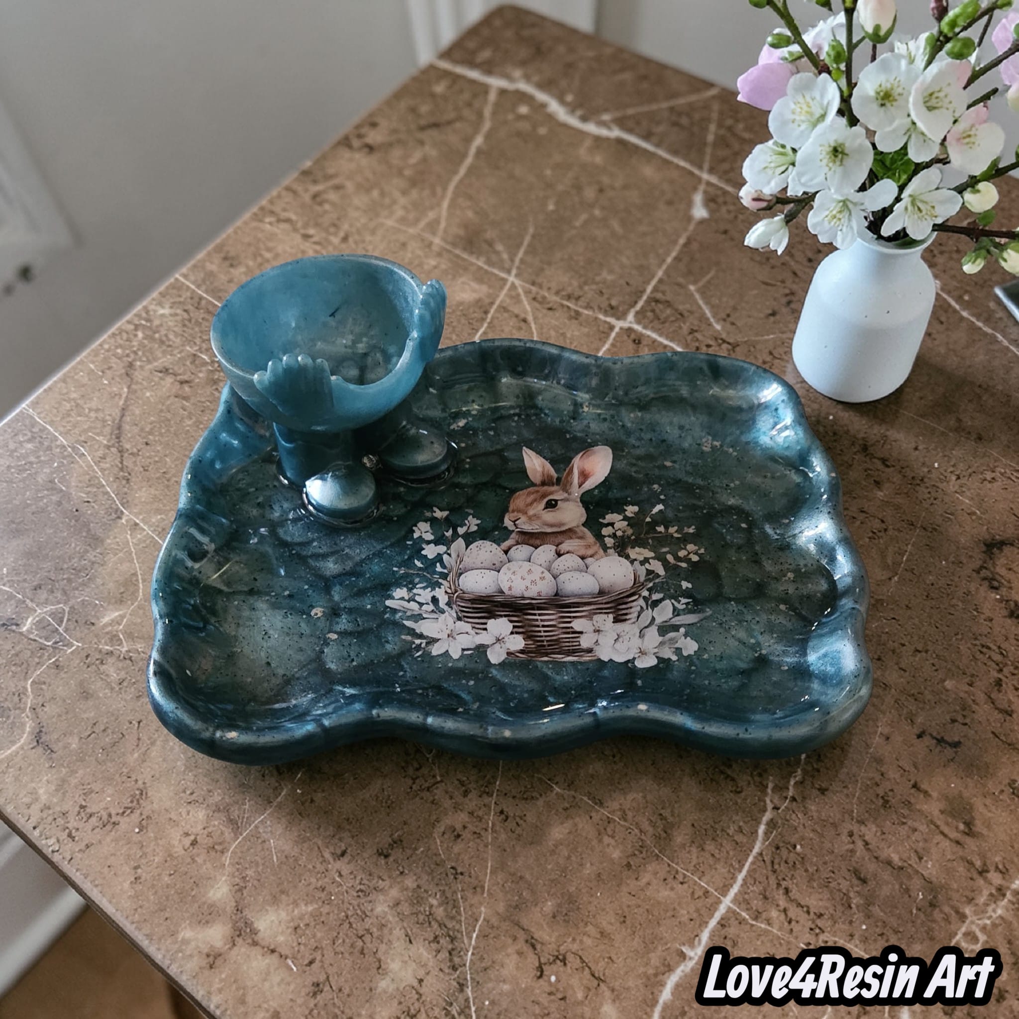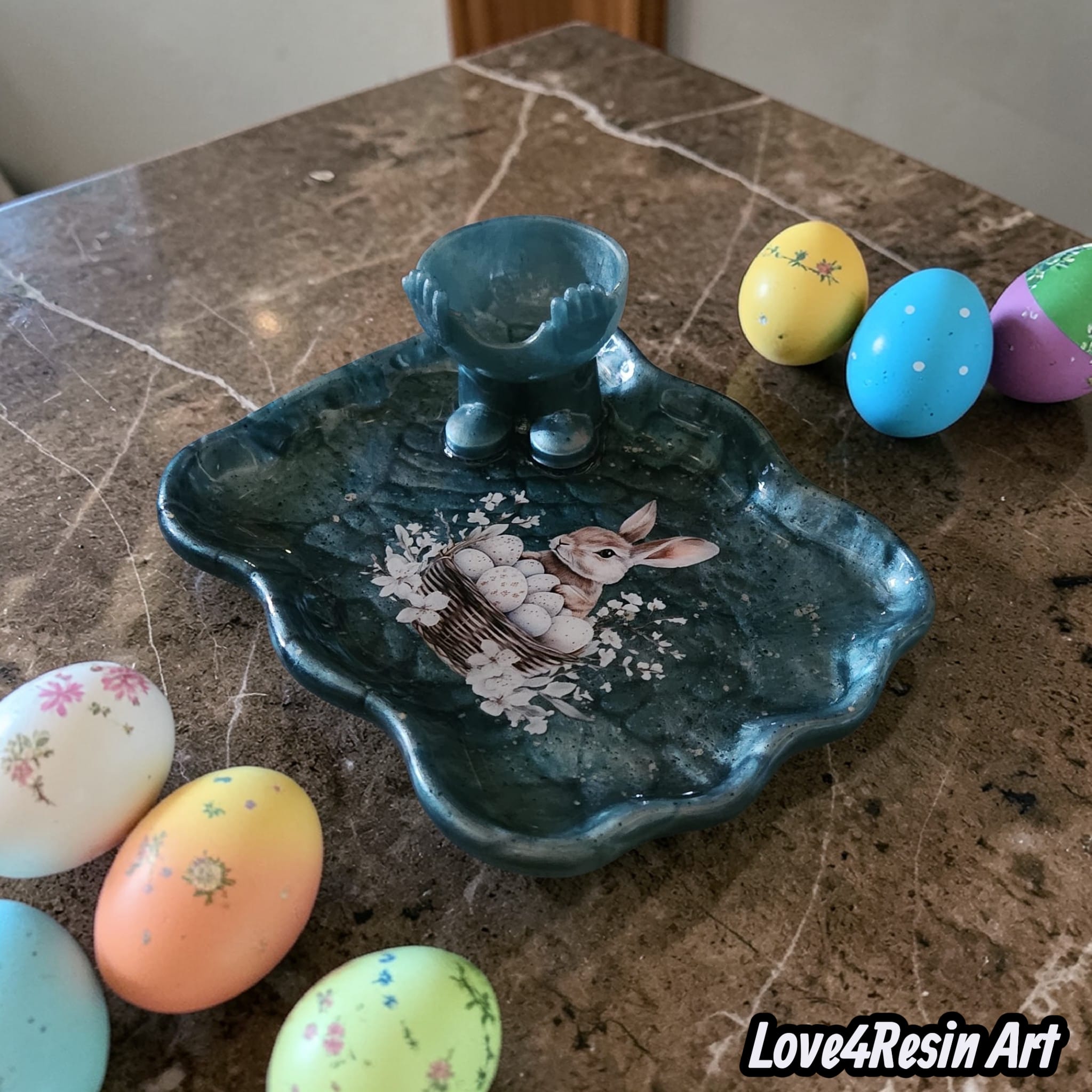 Cu un design delicat, în nuanțe profunde de verde-albăstrui și cu un iepuraș atent ilustrat în centrul său, tăvița aduce un aer cald, tradițional și elegant în orice casă. Suportul pentru ou, cu formă jucăușă și brațe care „îmbrățișează” oul, transformă simplul gest de a ciocni și decoji oul de Paște într-o experiență organizată și plăcută.